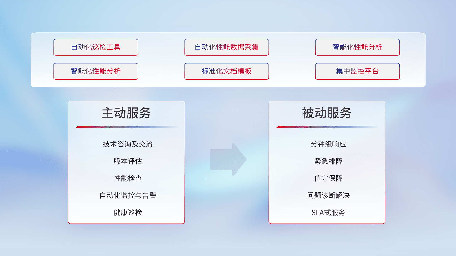 智能化工具和标准化文档,,,保障服务质量,,,,提供主动服务(包含技术咨询、、、、版本评估、、、、性能检查、、、、自动化监控与告警、、、健康巡检)和被动服务包含(分钟级响应、、紧急排障、、、、值守保障、、、问题诊断解决、、SLA服务)。。。。